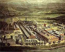 In 1881, the Hudson Riverfront Art Park in Rensselaer was the site of the first recorded major league Grand Slam in baseball history.[10] In 1882, the Hudson River Aniline and Color Works built their first plant in Rensselaer (building 61), however it burned 13 years later. In 1895, Building 61 was rebuilt and at the same time Building 71 was built as well.[11] It was acquired by the Bayer Corporation in 1903,[12] which then built one of the largest and most up-to-date factories of its time in the US and the Rensselaer plant became the American home for the production of brand-name Aspirin.[13] The US government seized the property in 1917 during World War I as enemy property, Bayer being a German company.[12] It would later be owned by the General Aniline and Film Company, and then BASF.[12] In 1927, it was the first plant to produce solid diazo salts in the United States.[14] The plant went through 12 separate owners or subsidiaries in its lifetime, in the 1990s it was the oldest dye plant in continuous operation and also produced more dye than any other plant in the United States.[14] According to a promotional brochure issued around 1993 by the BASF Corporation the Rensselaer plant was the largest North American dyestuffs production facility.[15] The plant was shut down for good on December 28, 2000.