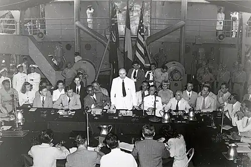 ![]() Delegations of the Kingdom, the Republic and the Commission of the Good Offices during the first plenary meeting on the American troopship Renville, Monday, Dec. 1947 | |