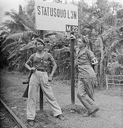 On 1 August 1947, an Australian resolution in the United Nations Security Council calling for a ceasefire between the Dutch and Indonesian Republican forces was passed. Dutch Lt. Governor-General Van Mook gave the ceasefire order on 5 August.[1] On 25 August, the Security Council passed a resolution proposed by the United States that the Security Council tender its good offices to help resolve the Dutch-Indonesian dispute peacefully. This assistance would take the form of a Committee of Good Offices (CGO, known locally in Indonesia as the Trilateral Commission (Indonesian: Komisi Tiga Negara, KTN, not to be confused with the current Trilateral Commission)) made up of three representatives, one appointed by the Netherlands, one by Indonesia and a third, mutually agreed by both sides. The Dutch chose a representative from Belgium, Indonesia chose one from Australia and both agreed on the US for the third member.[2][3] A few days later, on 29 August 1947, the Dutch proclaimed the Van Mook Line, claiming it marked the extent of the areas they held as of the ceasefire. However, the Dutch included areas of Indonesia the Dutch had not reentered. The republic was left with about a third of Java and most of the island of Sumatra, but the republican forces were cut off from the main food-growing regions. A Dutch blockade then stopped arms, food, and clothing from reaching the republicans.[4]