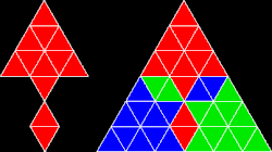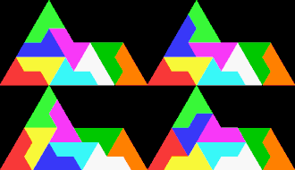 The "sphinx" polyiamond rep-tile. Four copies of the sphinx can be put together as shown to make a larger sphinx.