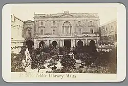 The southeast side of the square, facing the Casa del Commun Tesoro, is the National Library of Malta, commonly known as the Bibliotheca. The building was commissioned when larger premises were required for the Order's library. It was designed by the Polish Italian architect Stefano Ittar,[11] and was completed in 1796. Due to the French occupation of Malta, the library did not open until Malta became a British protectorate. It was officially inaugurated by Civil Commissioner Sir Hildebrand Oakes in 1812. The library has remained there ever since.[12][13]