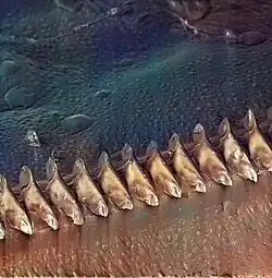 Katydids and their relatives in Ensifera use modified areas of the fore-wings, called stridulatory files, to produce broadband and pure sound which is used for mate location. The two wings are vibrated against each other, and the files produce specific tones, which are amplified as they pass across certain wing cells.[5] The known wings of Republicopteron are all lacking stridulatory files, possibly indicating that they did not "sing", or sing using the same means as other Ensiferans.[2]