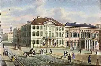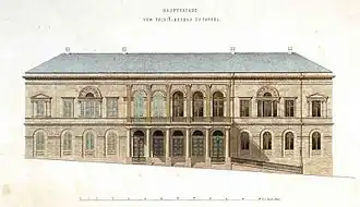 The Red palace was constructed between 1821 and 1826 based on a design by Bromeis, and was considered his master work.[1] Its interior, designed in Empire style, was created with help of Daniel Engelhard and Julius Eugen Ruhl, with the finishing touches completed by 1837.[1] It was one of the best examples in Empire style in Germany. It was also characterized by particular effective colour combinations.[2]