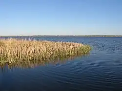 On the eastern, southern, and western sides, extensive reed beds intersected by a network of ditches adjoin the lake. More stable ground covered with forest is located on the northern shore.[2]