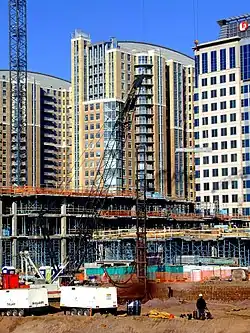 In late 2015, Boston Properties broke ground for the redevelopment of the surface parking lot north of Fountain Square. The Signature apartments, a pair of high rise residential towers, opened on the site in February 2018.[8] Soon thereafter construction began across President's Street for a glass-clad office tower dubbed 17Fifty. The 17-story building took the place of low-rise retail built during the initial phase and opened in 2020.[9][10]