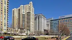Nearly ten years later, construction commenced west of Library Street on Phase Two, starting on the north side of Market with the erection of the 18-story One Freedom Square and 16-story Two Freedom Square (completed in 2000 and 2001, respectively).[4] Construction also began on the low-rise condominiums and townhomes surrounding Town Center Parkway. Development continued with the 2006 opening of three residential high-rises immediately west of Freedom Square, and the construction of the three South of Market office buildings which were completed in 2008. Along the south side of Democracy Drive, a nine-level parking garage topped by Democracy Tower was completed in 2009.[5] The final portion of the second phase was completed in 2013 with the opening of The Avant, a 15-story apartment high-rise south of Reston Town Square Park.[6][7]