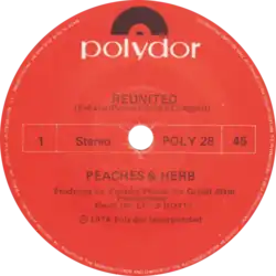 "Reunited" is a hit ballad for R&B vocal duo Peaches & Herb. As the second single release from their album, 2 Hot (1978), the song was a huge crossover smash, topping both the pop and soul charts. It spent four weeks at number one on both the R&B singles chart and the Billboard Hot 100 singles chart in 1979[4] and sold over two million copies. Billboard ranked it as the No. 5 song for 1979. In Canada, "Reunited" likewise reached number one and was the No. 9 song for the year.[5]