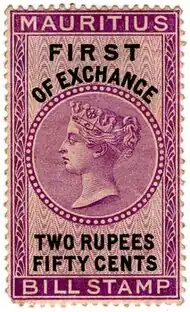 The first bill stamps of Mauritius were issued on 28 March 1869. They were locally lithographed and imperforate, with values ranging from 1d to 16s8d in various colours. They were printed in triplets inscribed First, Second or Third of Exchange for use on triplicate documents. Later that year a new set portraying Queen Victoria was issued, also in triplets. Stamps in this design, with various changes in colour and currency, continued to be used until 1903. In 1904 a new type appeared, similar to the design used for high value postage stamps, but with a blank value tablet and in green. These were then overprinted BILLS ONLY FIRST (or SECOND or THIRD) OF EXCHANGE and the value. Two slightly different formats exist.[1]