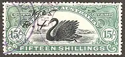 In 1941, a new set was issued inscribed REVENUE DUTY W.A. This also showed the swan, but the design was now smaller. Initially five values from 1d to 1/- were issued, but new values continued to be issued, the highest being the £10 in 1951 and in 1963. This set remained in use until the Australian dollar was adopted in 1966. From that year until 1973, a large set of sixteen values from 1c to $50 was issued. Each value had a different wildlife design.