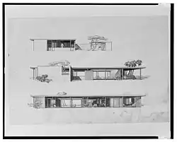 Going back to the drawing board, Rudolph produced a new plan, loosely based on the Mies van der Rohe (Barcelona Pavilion); a scaled-down (1,000 square foot), linear, flat-roof, single-story structure, to be constructed almost entirely of concrete and glass. The low roof (less than eight and a half feet off the ground) would be supported by steel perimeter poles, and extend beyond the frame of the house to create overhangs for shade. At one end, the roof overhang would extend several feet to serve as a carport. The exterior walls were to be made of lamolithic panels, as well as floor-to-ceiling sliding glass doors that would open onto large exterior patio areas. Jalousie windows were strategically positioned to promote natural ventilation and cooling. A hole would be cut into the roof to bring light into an incorporated screened-in porch (with grass inside) to further intermingle interior and exterior space.[5]