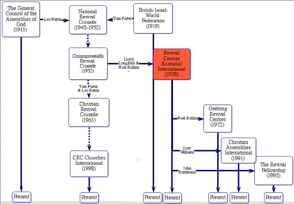 The Revival Fellowship was formed as a result of a 1995 schism with the Revival Centres International. At a Christmas church camp in 1994 Lloyd Longfield (head-pastor of the Revival Centres International) instituted a policy that sexual defaulters would be permanently excommunicated and could never be restored to fellowship. The Adelaide assembly, led by pastor John Kuhlmann, opposed the move - withdrawing from the Revival Centres with approximately half of the assemblies (30), a third of pastors (35) and probably over half of the membership (3,300 including 120 from Melbourne - the bulk of membership outside of Victoria and Tasmania). Approximately half of the missions work in Papua New Guinea became part of the Revival Fellowship (15,000 people), as well as various other international assemblies (including assemblies in Europe, Africa, New Zealand, the Pacific and the Americas).[3]