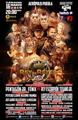 Starting in 1997 and every year since then, the Mexican Lucha Libre, or professional wrestling, company AAA has held a Rey de Reyes (Spanish for "King of Kings') show in the spring. The 1997 version was held in February,[1] while all subsequent Rey de Reyes shows were held in March. As part of their annual Rey de Reyes event AAA holds the eponymious Rey de Reyes tournament to determine that specific year's Rey.[2] Most years the show hosts both the qualifying round and the final match, but on occasion the qualifying matches have been held prior to the event as part of AAA's weekly television shows.[3] The traditional format consists of four preliminary rounds, each a Four-man elimination match with each of the four winners face off in the tournament finals, again under elimination rules.[1] There have been years where AAA has employed a different format to determine a winner.[3] The winner of the'Rey de Reyes tournament is given a large ornamental sword to symbolize their victory, but is normally not guaranteed any other rewards for winning the tournament, although some years becoming the Rey de Reyes has earned the winner a match for the AAA Mega Championship. From 1999 through 2009 AAA also held an annual Reina de Reinas ("Queen of Queens") tournament, but later turned that into an actual championship that could be defended at any point during the year, abandoning the annual tournament concept.[4][5][6] The 2019 show was the 23rd Rey de Reyes show in the series.