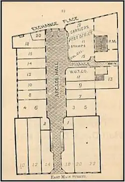 In later years, the arcade served as the main entranceway to Corinthian Hall, which was built by Reynolds in 1849 and located across the street from the arcade's rear entrance.[5] The hall was a prominent location for lectures, concerts, plays, balls, parties and fairs.[6]