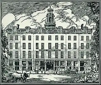 Built of brick, it was four-and-a-half stories tall and almost 100 feet wide. It contained 86 rooms arranged on either side of a 15-foot-wide, skylighted corridor that extended from the primary entrance on Main Street to the rear entrance on the next street to the north. On top, it had an observation tower, and it had 14 cellars.[2][3]