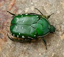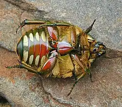 Rhabdotis aulica, known as the emerald fruit chafer, is a species of Scarabaeidae, the dung beetle family, and is found in Africa. Adult beetles, which are about 25 millimetres (0.98 in) long, feed on flowers and fruit, laying their eggs in goat and cattle manure. The pupae develop inside egg-shaped protective clay shells.