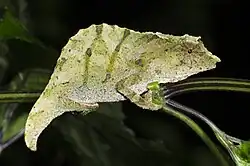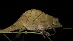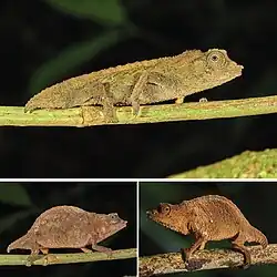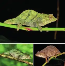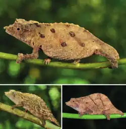 Rhampholeon (from Greek: ῥάμφος rhamphos, 'bird's bill' and Greek: λέον leōn, 'lion')[1] is a genus of small chameleons, commonly known as pygmy chameleons or African leaf chameleons, found in East Africa and Central Africa. They are found in forests, woodlands, thickets, and savanna, and most species are restricted to highlands. They are brown, grey, or green, and typically seen at low levels in bushes, or on the ground among grasses or leaf litter.