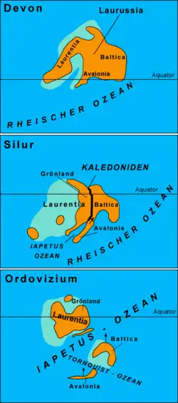 At the beginning of the Paleozoic Era, about 540 million years ago, most of the continental mass on Earth was clustered around the south pole as the paleocontinent Gondwana. The exception was formed by a number of smaller continents, such as Laurentia and Baltica. The Paleozoic ocean between Gondwana, Laurentia and Baltica is called the Iapetus Ocean. The northern edge of Gondwana had been dominated by the Cadomian orogeny during the Ediacaran period. This orogeny formed a cordillera-type volcanic arc where oceanic crust subducted below Gondwana. When a mid-oceanic ridge subducted at an oblique angle, extensional basins developed along the northern margin of Gondwana.[4] During the late Cambrian to Early Ordovician these extensional basins had evolved a rift running along the northern edge of Gondwana.[5] The rift in its turn evolved into a mid-oceanic ridge that separated small continental fragments such as Avalonia and Carolina from the main Gondwanan land mass, leading to the formation of the Rheic Ocean in the Early Ordovician.[6]