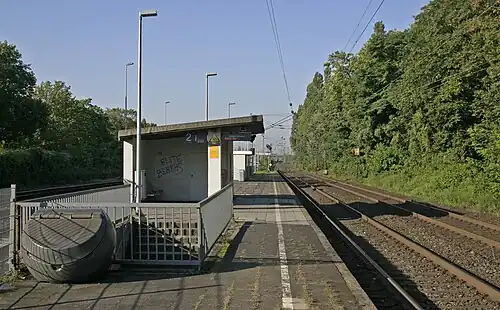 Rheinhausen Ost (east) is a station designated as a Haltepunkt (halt) in the Duisburg suburb of Rheinhausen in the German state of North Rhine-Westphalia. It was built in 1907 after the commissioning of the Rheinhausen–Kleve railway on the left (western) bank of the Lower Rhine for workers of the Krupp’s steel works. The station was directly at the main entrance to the steel works, Tor 1 (gate 1), which is now heritage-listed.