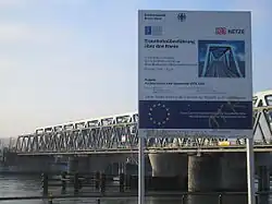 On 14 March 2006 France and Germany agreed the framework for the construction of the extended high speed LGV Est railway line.[1] The project required that trains be able to cross the Rhine at Kehl at speeds of up to 120 km/h (75 mph) at a time when the single track 1956 bridge was restricted to 60 km/h (37 mph).[2] Provision was therefore made for a twin track bridge. Work began in March 2008 with completion scheduled for the end of 2010.