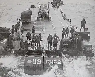 A rhino ferry is a barge constructed from several pontoons which are connected and equipped with outboard engines, used to transport people and heavy equipment. Rhino ferries were used extensively during the Normandy landings[1] and other theaters (Attu, Africa, Sicily, Italy); their low draft was well-suited for shallow beaches, and they could also be used as piers when filled with water.[2] An alternative to tank landing craft, they were operated by United States Navy Construction Battalions.[3] They ferried their cargo from the outlying Landing Ships, Tank to the shore.[4]