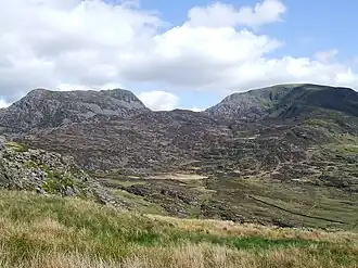 The Rhinogydd (a Welsh plural form, often anglicised as Rhinogs and also known by the alternative Welsh plural Rhinogau) are a range of mountains located east of Harlech in North Wales. The name Rhinogydd derives from the names of two of the more famous peaks, Rhinog Fawr and Rhinog Fach, although the greatest elevation in the range is reached by Y Llethr, 756 m (2,480 feet).