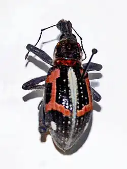 Black, nitid; head densely punctured in front, lightly behind, covered with a thin ashen pubescence and furnished with a number of strong hairs about the mouth. The extremity of the snout as broad as the head. Thorax scarcely longer than broad, broader at the base than the apex, and also broader than the head, very regularly marked, and with a depression on the anterior part of the median line. A broad depressed space on the side and under surface of the apex of the thorax is densely covered with reddish golden scales, and on each side from the middle to the base there is a broad vitta of the same. The elytra are convex, broader than the thorax, with a prominent humeral callus, and pointed at the apex; on each elytron are nine rows of large oblong punctures, the intervals scarcely raised; the extreme apex is mucronate. A sutural vitta including the scutellum, a broadish fascia behind the shoulder and not reaching the suture, and a narrower rather curved fascia behind the middle and extending to the suture, are densely clothed with golden scales. The metasternum is similarly clothed. The legs are sparingly punctured, each puncture with a short seta. [3]