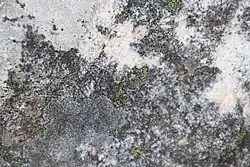 Rhizocarpon viridiatrum is a species of saxicolous (rock-dwelling), crustose lichen in the family Rhizocarpaceae.[2] The species is characterized by its distinctive yellowish-green colouration due to rhizocarpic acid and its parasitic lifestyle, initially growing on other crustose lichens before becoming independent. It forms small, compact thalli rarely exceeding 2 cm across, composed of tiny areoles with scattered black fruiting bodies. The lichen is found across Europe, typically inhabiting siliceous to moderately calcareous rock surfaces such as basalt.