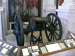 A 12-pound bronze Civil War–era Napoleon cannon known as The Gettysburg Gun stands just inside the first floor entrance.[13] During the artillery barrage before Pickett's Charge, a Confederate cannonball lodged itself in the muzzle of the gun used by Battery B, 1st Rhode Island Light Artillery Regiment, putting it out of service.[13] The gun was first displayed in Washington, D.C.; in 1874, Rhode Islanders requested that it be brought home, where it was installed at the State House.[13] In 1988, to commemorate the 125th anniversary of the battle, the gun was temporarily returned to the exact spot in Gettysburg National Military Park where it had been disabled.[13]