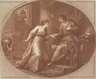 According to Herodotus, she was a fellow-slave of the fable teller Aesop, with whom in one version of her story she had a secret love affair; both of them belonged to Iadmon of Samos. She afterwards became the property of Xanthes, another Samian, who took her to Naucratis in Egypt, during the reign of Amasis II, where she met Charaxus, brother of the poet Sappho, who had gone to Naucratis as a merchant. Charaxus fell in love with her, and ransomed her from slavery with a large sum of money, so that henceforth all the money she made from her profession would be her own.[3] Sappho later wrote a poem accusing Rhodopis of robbing Charaxus of his property.[4]: 189 She also ridiculed her brother in one of her poems for getting himself entangled with Rhodopis.[5]