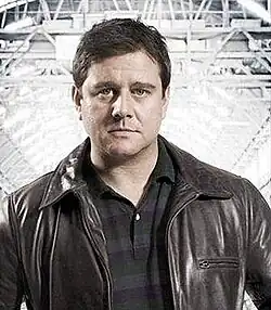 The plot of Children of Earth results in Rhys becoming more directly involved with the Torchwood team's activities, and actor Kai Owen also receives star billing for the first time.[57] Whilst Gwen by the third series has become a more militant character,[49] Rhys retains his everyman status and takes on the role of audience surrogate; press material describes him as "the ordinary guy in the street" and "the normal person's eyes and ears" who "says what he thinks about the situations Torchwood find themselves in, bringing the reality back to them".[58] Paul Collins comments of the significance of Rhys having the first dialogue in the serial, remarking that this is Torchwood's "determination to establish its domestic credentials before subverting them".[59] Rhys becomes a reluctant hero; Kai Owen states that he "would rather not get involved if he had the choice", but when faced with the life-or-death situations in the serial "he doesn't run away from it" because the character has "seen so many things".[58] This, in Owen's eyes, makes the Rhys seen in Children of Earth a "very brave hero who has grown in stature".[60] Rhys retains core character status for the fourth series, Torchwood: Miracle Day.[61][62] Whilst Kai Owen explains that Rhys will always be at the forefront of "Gwen's troubles or fights or adventures" because of his concern for her,[61] he remains unafraid to tell her when she has become too consumed by her job.[62] Davies links the relationship between Gwen and Rhys in the fourth series to the show's continued exploration of human sexuality, stating that "open sexuality has to include everything" including "a husband/wife great big crime-fighting team ... happily in love".[63]