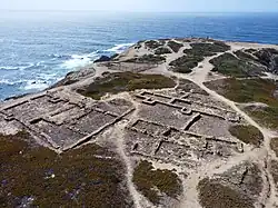 The ribat is located on the Ponta da Atalaia, about 1 km north of Arrifana Beach. It was constructed around 1130, probably by the Sufi and Mahdi master of Christian origin, Abūʾl-Qāsim Aḥmad ibn al-Ḥusayn ibn Qasī, one of the leading political and religious figures in al-Andalus, the Muslim territory that covered most of Iberia during the Islamic Golden Age. Between 1130 and 1140 Ibn Qasi wrote his main work, The Removal of the Sandals, which was inspired by both the Old Testament and the Quran. In 1151 he was assassinated in Silves after being accused of betraying Islam by the followers of Abd al-Mu'min and Ibn Almúndir. After this the Ribat of Arrifana was abandoned, with the English crusader and chronicler, Roger of Hoveden, reporting forty years later that it was “recognizable but in ruins”. It is believed that the minaret was used as a watchtower in the fourteenth century. Despite appearing in written records dating back to 1786 and being clearly identifiable as a former inhabited area as late as 1841,[1] the location of the ribat was only identified by archaeologists at the beginning of this millennium. Its architectural features are inspired by the ribats identified in North Africa.[2] [3][4][5]