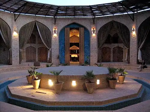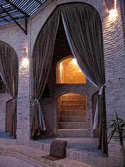 The caravanserai's exterior view appears like a "derelict ruin" though its interior is well furbished in its original form making it an "atmospheric and fascinating" place to stay.[3]