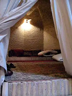 Its recent renovation took three years to complete, and included the use of 13,000 pumice stones to remove the grime on the interior walls.[1] Restored to a near original state, the rooms are on a raised base and mattresses are provided on the floor, which are covered with carpets. There is no door separating the rooms from the corridor, with only a curtain providing privacy to the occupants. However, the common bathroom facility is well fitted.[1][4] The building accommodates 60 to 80 tourists daily; tourists from 70 countries are reported to have stayed here.