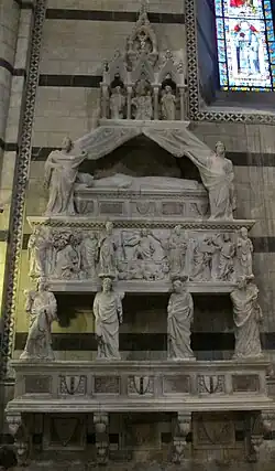 After he died in February of 1314, his mortal remains were transferred three years later to Siena, where Tino di Camaino was commissioned to build a monumental tomb for him, initially set up in the north transept of Santa Maria Assunta (but moved several times).