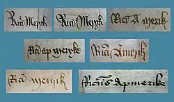 "Amerike" is an anglicised spelling of the Welsh name ap Meurig, ap Meuric or ap Meryk, which means "son of Meurig".[1] It was, however, only one of the many different ways that the customs officer's name was rendered, even in official documents. The "Amerike" version was noted by some modern historians because it looked like "America" and because this was how his name was spelled on a tomb brass created for his daughter in 1538.[2]