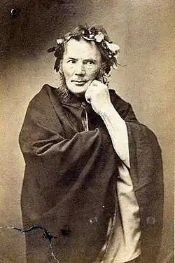 Lucas produced many etchings depicting his own sculptural works, biblical stories, and scenes from eighteenth-century poetry. A nearly complete series of these, mounted in an album bound by Lucas himself, and including a frontispiece portrait of the artist, was held the British Museum.[1] These albumen "cartes de visite"[15] (now in the National Portrait Gallery) show Lucas in a variety of theatrical and expressive poses that further reveal his eccentricity.[2]
