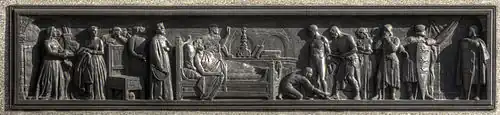 Marochetti also intended to add bas-reliefs to either side of the pedestal and had provisioned it with "sunk panels" ready for the reliefs to be installed. He proposed to create four "alto relievos in the style of the Ghiberti doors on the Battisterio at Florence", depicting the coronation of Richard in Westminster Abbey, the taking of Ascalon, Richard as a prisoner of the Saracens and Richard on his deathbed. He quoted £2,500 for all four, but Parliament voted instead to grant him £1,500 for two scenes – Ascalon and the death of Richard.[2]