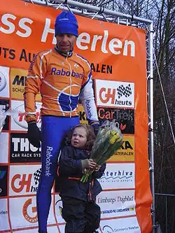In 1996 Groenendaal joined the newly formed Dutch cycling team Rabobank which he would stay with until the end of the 2006–07 season when he choose to ride for an individual sponsor. Groenendaal's greatest achievements include winning the Cyclo-Cross World Cup in 1998, 2001 and 2004 and becoming Cyclo-Cross World Champion in 2000. Groenendaal attacked during the first lap and was chased by defending cyclo-cross world champion Mario De Clercq who was followed by Groenendaal's Rabobank teammate Sven Nys. Nys would not cooperate in the chase of his commercial teammate and as a result De Clercq never caught Groenendaal enabling Groenendaal to become World Champion.[3] In the following season, Groenendaal dominated cyclo-cross with wins in the Superprestige series and the World Cup as well as being number one UCI ranked rider. Groenendaal also won the Dutch National Cyclo-cross championships. Groenendaal started as a big favourite for the World Championships but suffered a crash during the race and did not recover and as a result lost his Rainbow jersey.[4] In the 2001–02 season, Groenendaal lost the national cyclo-cross jersey to teammate Gerben de Knegt but did win the final World Cup of the season in Heerlen which made him a favourite for the World Championships which were taking place a week later. However, Mario De Clercq won ahead of Nys and Vannoppen. Groenendaal finished fourth and as best non-Belgian. Groenendaal won the first race of the Gazet van Antwerpen trophy of the 2002–03 season with the Koppenbergcross ahead of Nys and Wellens. He also won a World Cup.