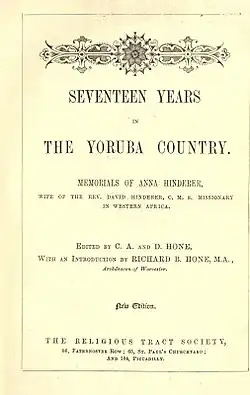 - ^ Anna Martin Hinderer (1877). Seventeen years in the Yoruba country: memorials of Anna Hinderer, wife of the Rev. David Hinderer, C.M.S. missionary in Western Africa. Religious Tract Society.