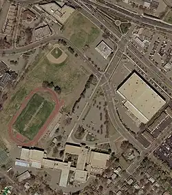 After a fire destroyed the old high school building in 1940, the building was rebuilt on the current site in 1942, measuring 49,167 sq ft (4,567.8 m2). Additions to the school were made in 1952 at 39,895 sq ft (3,706.4 m2), 1959 at 37,425 sq ft (3,476.9 m2), in 1964 at 56,703 sq ft (5,267.9 m2), 1969 at 4,000 sq ft (370 m2), 1975 at 35,890 sq ft (3,334 m2), 1976 at 8,300 sq ft (770 m2), and 1988 at 1,938 sq ft (180.0 m2). By this point, the campus had reached 26.2 acres (106,000 m²) in size.[8][9]