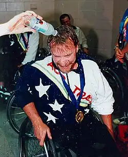 ![]() Richard Oliver is sprayed with water after being presented with the gold medal at the Atlanta Paralympics | |||||||||||||||||||||
