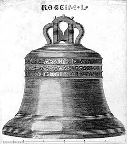 In 1709, Richard Phelps cast a new bell, which was delivered to the Cathedral before the old one was taken away, but the new bell also failed.[8] Nine years later Phelps was given the job of recasting it once again. The present bell is described by Phelps’ successors Charles and George Mears as being 6 feet 9 inches (2.06 m) in diameter, 6 feet 4.5 inches (1.943 m) , and with thickness at sound bow 5.25 inches (133 mm), and weighing 76 long hundredweight (8,500 lb; 3,900 kg).[9] The larger part of the metal of which it is made came from Great Tom of Westminster.[10] It bears the inscription:
