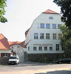 Riemerschmid designed the site plan, the factory and some of the housing for Hellerau (now part of Dresden), which was the first garden city of the English type to be built in Germany.[22] As an architect, he is known particularly for his houses: his own house in Munich, the Villa Fischel in Kiel, the Fieser villa in Baden-Baden, and the Frank villa in Göttingen and country house in Witzenhausen, and for the uncompleted "Walddorfstraße" workers' housing complex in Hagen, Westphalia, although his major contribution to Jugendstil architecture was his interior for the Munich Schauspielhaus (playhouse; later the Kammerspiele).[3][23]