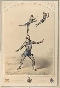 As a circus performer, Carlisle is known for establishing the Risley act; he is noted as being the first to perform this act in the Guinness Book of World Records.[1] The act involves the performer lying on his or her back on a chair and juggling children with the feet, an act also used by the Hanlon-Lees and others.[8] It has alternatively been referred to as the "Risley business"[9] or the "Risley stunt".[10] Carlisle developed this act as early as 1840–1841.[3] The act has since come to refer to juggling anything with the feet while lying on one's back.