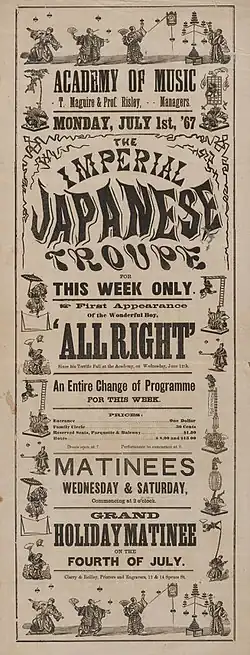 - ^ Schodt, Frederik L. Professor Risley and the Imperial Japanese Troupe: How an American Acrobat Introduced Circus to Japan — and Japan to the West. Stone Bridge Press, 2012: 35. ISBN 9781611720099