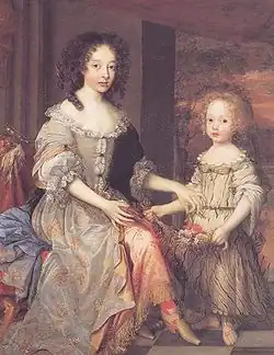 Over the next decade, Talbot used his influence with James to cement his position at court: he began building links with others, like the Earl of Orrery, who were hoping to supplant the "Old Royalists" such as Ormond.[5] He remained a divisive figure at court thanks to his imposing presence, domineering manner, and "strong opinions expressed with much swearing".[5] In 1669 he married noted beauty Katherine Baynton, daughter of Colonel Matthew Baynton and Isabel Stapleton. They had two daughters, Katherine and Charlotte;[8] Baynton died in 1679.[9]