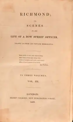 Richmond, or, Scenes in the Life of a Bow Street Officer is an 1827 crime novel published anonymously and often attributed to Thomas Skinner Surr. The journalist Thomas Gaspey has also been credited as the author.[1][2] It was originally published in three volumes by Henry Colburn of New Burlington Street. It blended a depiction of the crime world of the Regency era with the fashionable silver fork novel, also functioning as an adventure novel.[2] The protagonist Tom Richmond, a picaresque figure, joins the Bow Street Runners after a misspent youth. It forms a bridge been early-eighteenth-century crime novels such as Moll Flanders and Colonel Jack with the future development of the full detective novel.[1]
