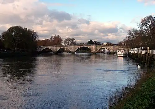 - ^ London Bridge (circa 55 AD), Kingston Bridge (date of construction unrecorded, but renovated in 1193 so dating from the mid-12th century at the latest), Putney Bridge (1729), Westminster Bridge (1739), Hampton Court Bridge (1752), Kew Bridge (1759), Blackfriars Bridge (1769) and Battersea Bridge (1771) predate Richmond Bridge, but have all been demolished and replaced since the construction of Richmond Bridge.