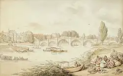 There was no formal opening ceremony, and little initial recorded public reaction.[23] However, the bridge soon became much admired for its design; an article in The London Magazine in 1779 said that the bridge was "a simple, yet elegant structure, and, from its happy situation, is ... one of the most beautiful ornaments of the river ... from whatever point of view the bridge is beheld, it presents the spectator with one of the richest landscapes nature and art ever produced by their joint efforts, and connoisseurs in painting will instantly be reminded of some of the best performances of Claude Lorraine".[24] James Paine proudly illustrated it among the designs in the second volume of his Plans, Elevations, and Sections of Noblemen and Gentlemen's Houses, 1783.[25] Richmond Bridge was the subject of paintings by many leading artists, including Thomas Rowlandson, John Constable and local resident J. M. W. Turner.[14]