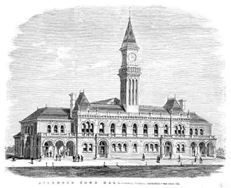 Built in the 1890s, the original Richmond Town Hall was in the Venetian Gothic Revival style, consisting of polychrome brickwork and a large tower. In the 1930s, the façade was remodelled in the Interwar Academic Classical Revival style, with Art Deco decorations, to become the Richmond City Hall.[1]